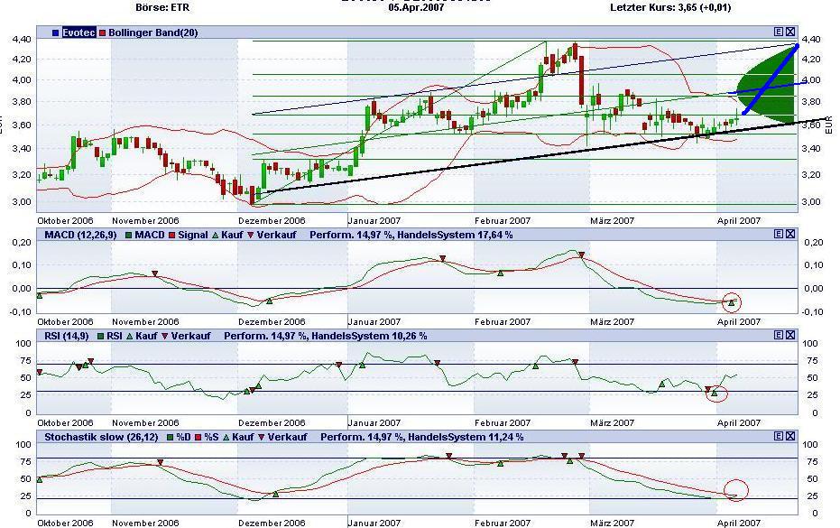 Aktuell aber, verlief die Konsolidierung bis 3,51 bilderbuchmäßig, wobei dei akt.Aufwärtstrend beibehalten wurde. MACD, RSI, Stochastik generieren eine kräftige Aufwärts(Gegen)bewegung in Übetreibungsphase sogar bis 4,39€
