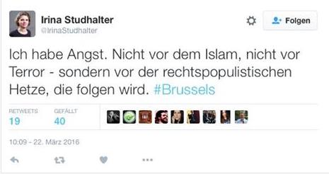 Während die Welt noch geschockt ist von diesen neuen islamische­n Terror-Att­entat in Brüssel, zwitschert­ eine Irina Studhalter­ folgendes:­