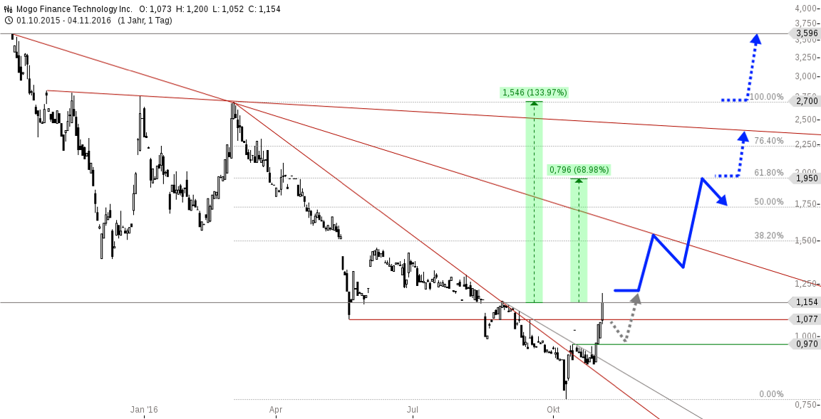 Durch den Ausbruch über die rote Abwärtstrendlinie bei 0,963 EUR und den Wochenschlusskurs deutlich darüber wurde ein Einstiegssignal generiert, dass aktuell ein neues Hoch bei 1,20 nach sich zog. Die dadurch aktivierten nächsten Ziele liegen bei 1,500 und 1,750 und nachfolgend bis hoch zum 61er Fibonacci Retracement bei 1,95 EUR. Das wären vom aktuellen Kursniveau aus gerechnet knapp 70% Wertsteigerung. Mittelfristig wären auch 2,25 (ca.100%), 2,70 (ca.130%) und später auch 3,59 (ca.210%) als durchaus mögliche Ziele zu nennen.
