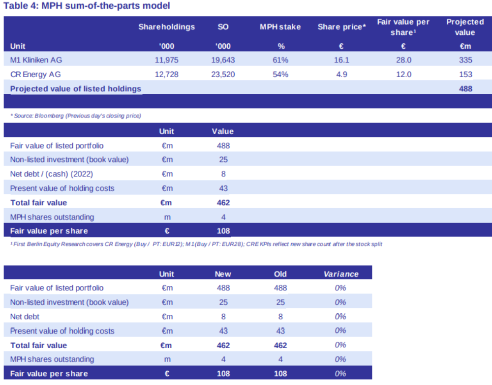BEWERTUNGSMODELL: Analyst Ellis Acklin (First Berlin Equity Research vom 18.12.2024) verwendet die Sum-of-the-parts-Bewertungs-Methodik zur Bewertung der MPH Health Care-Aktie. Dabei legt der Analyst den von ihm prognostizierten f a i r e n Wert (nicht dem aktuellen Börsenwert!) der Töchter M1 Kliniken AG und CR Energy AG zugrunde und kommt damit auf ein MPH-Kursziel von 108 €. Den Anteilsbesitz der MPH an M1 Kliniken und CR Energy (61% bzw. 54%) entnimmt der Analyst der letzten Sechs-Monats-Berichterstattung der MPH.