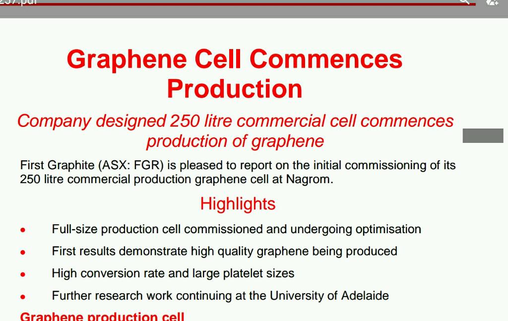 Auch wenn es September oder noch später wird. Hochwertiges Graphen ist schwierig weiterzuverarbeiten. Wird ganz dünnschichtig auf kupferplatte aufgetragen. Frage ist dann, wie löse ich das Graphen von der Platte, ohne Schicht zu beschädigen und wie kann ich es kommerziell einsetzen. Hab mal gelesen, 1 Gramm einer dünnen graphenschicht kann eine Katze von 4 Kilo tragen, natürlich ohne die kupferplatte unten drunter.