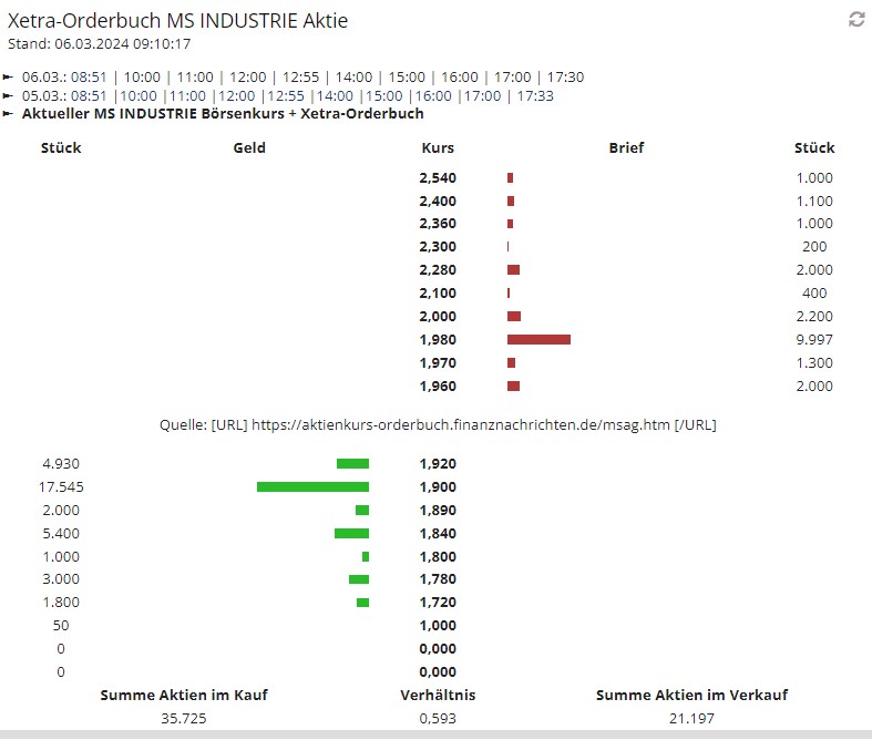 Bei MS Industrie verfolge ich seit Januar das Orderbuch und es fällt ein Käufer mit hohen Stückzahlen zu 1,90€ aus.