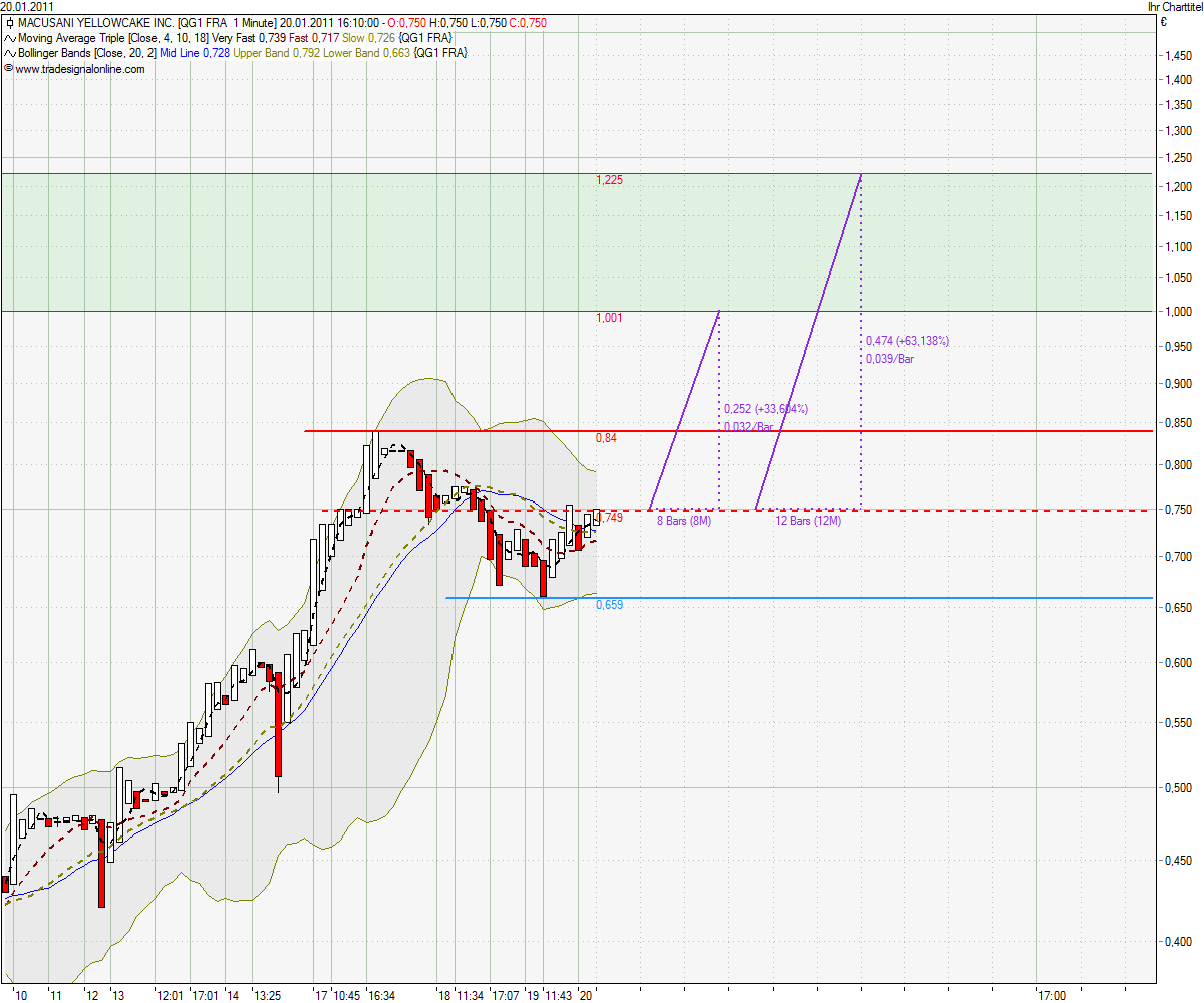 In Canada sollten die 0,37-0,38 Cent jetzt halten ansonsten geht´s noch weiter runter Richtung 0,3 Cent. Dort wartet dann die nächst größere Unterstüzung. In Frankfurt heisst das also, Kurse bis 0,26 € sind möglich, spätestens bei 0,19 - 0,22 € kann man eine Order setzen, da dort eine gute Unterstüzungsline ist.
