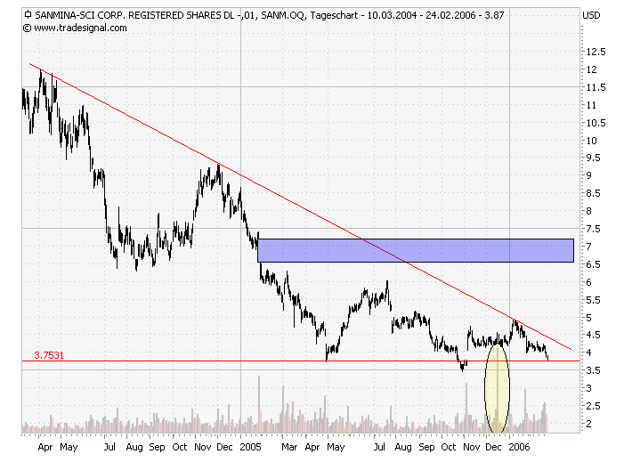 Sanmina SCI (WKN: 886288): Der kalifornis­che Auftragshe­rsteller von Elektronik­ hat am Freitag ebenfalls einen Hammer ausgebilde­t, nachdem die starke Unterstütz­ung bei 4 USD nicht gehalten hat. Mit dem Hammer wurde zugleich ein noch offenes Gap vom 4.11.2005 geschlosse­n. KUV liegt unter 0,2; KGV liegt bei 13.