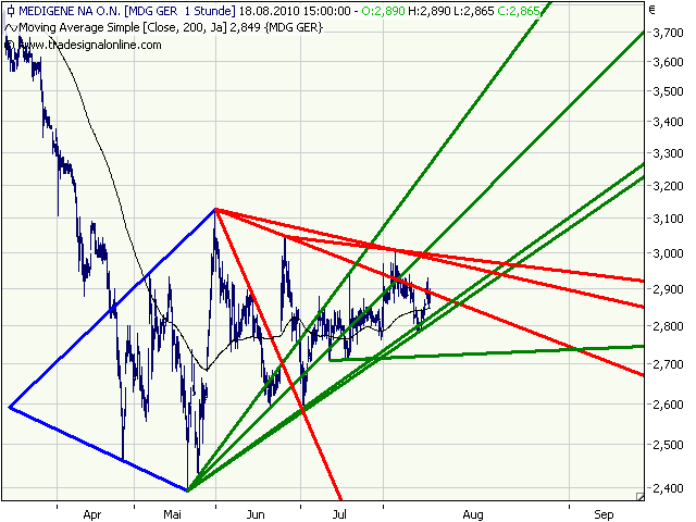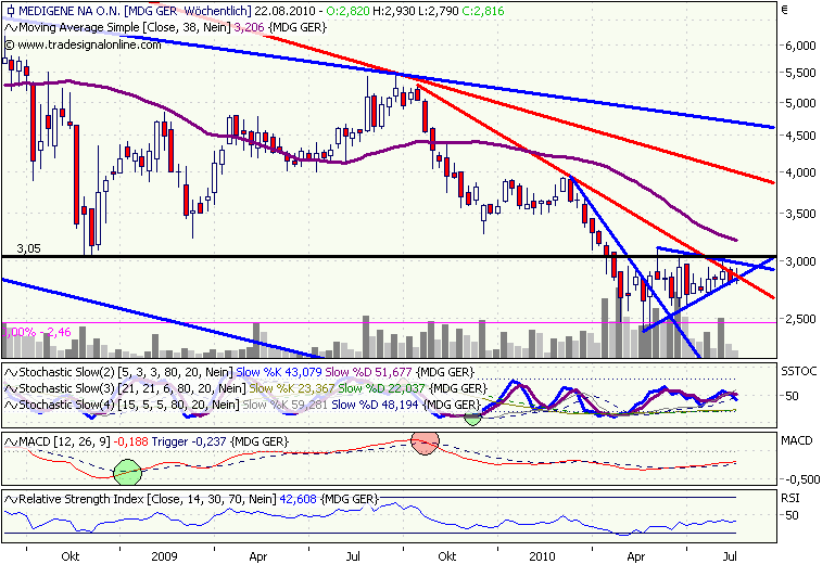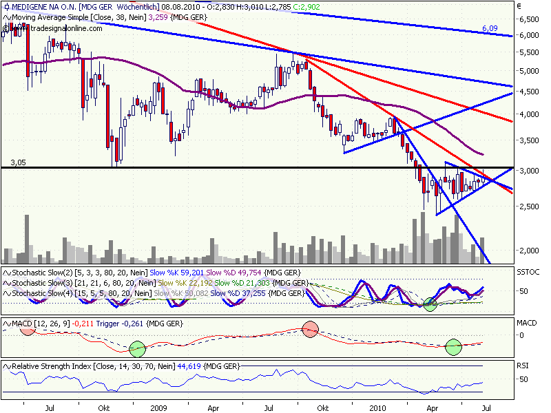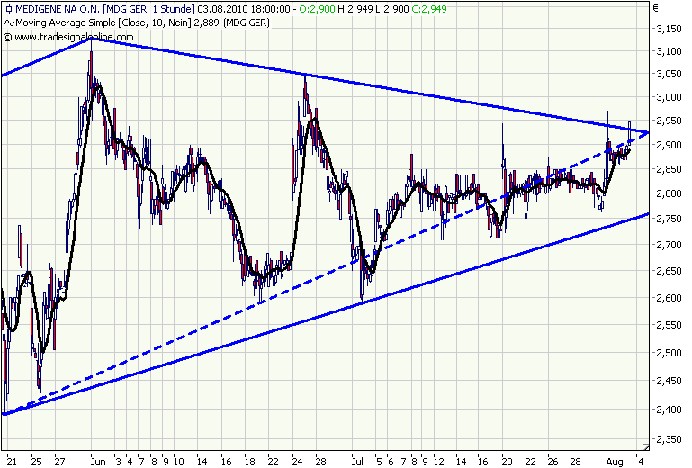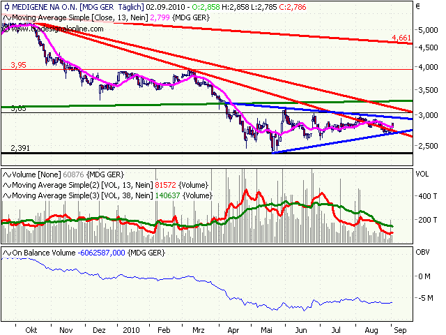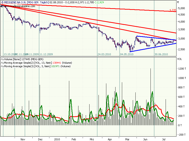Sollte Medigene den Ausbruch aus Downtrend und steigendem Dreick schaffen, dann dürfte es bis ca. 3,75 gehen. Da waren die Hochs von Januar und März.