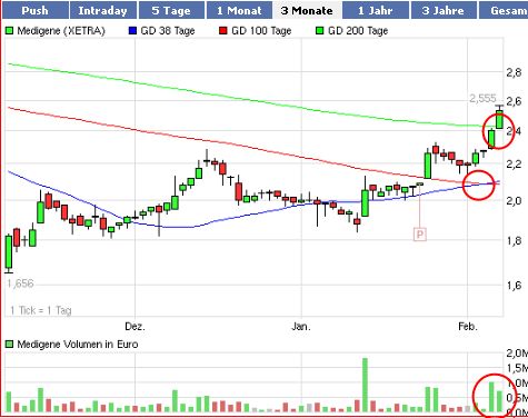Sollten jetzt noch die 2,10€ geschafft werden, ist nach lnger Zeit die 38-Tagelinie durchbrochen und es könnte noch bis zum nächsten Wiederstand von 2,20€ gehen.