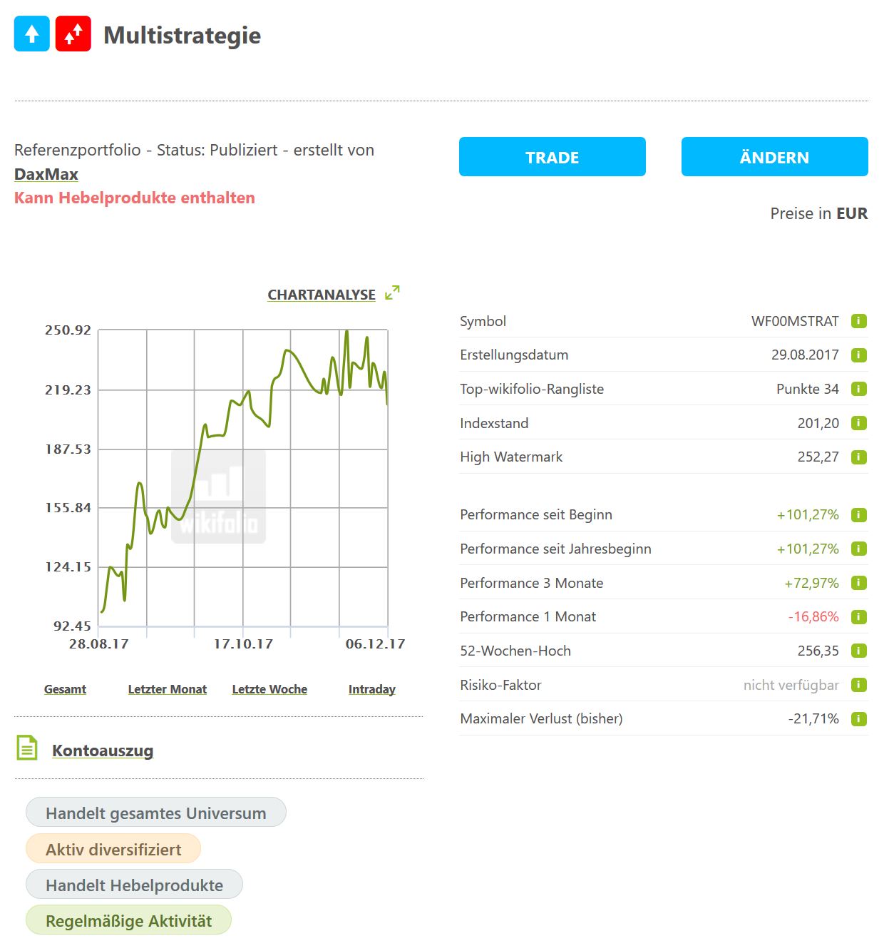 In meinem neuen wikifolio "Multistrategie" kombiniere ich mehrere Strategien, die zur jeweiligen Zeit als besonders erfolgsversprechend erscheinen. In den letzten 3 Monaten konnten hier mehr als 70% Gewinn erzielt werden. Ich freue mich über eure Vormerkung, damit das wikifolio möglichst schnell investierbar wird. www.wikifolio.com/de/de/w/wf00mstrat