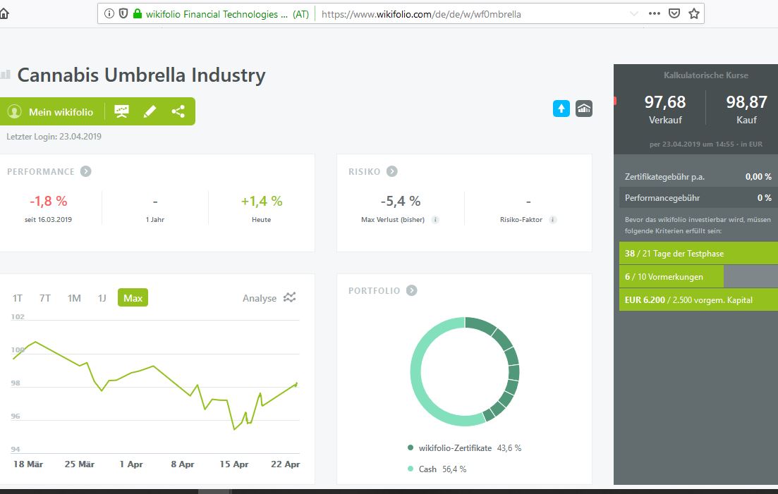 neue Wikifolio werden nur ins Portoflio aufgenommen, wenn es sich um reine Cannabis Wikifolio handelt; d.h. es dürfen vom jeweiligen Trader, im jeweiligen Wikifolio ausschliesslich Cannabis,Hanf,CBD oder im weitesten Sinne mit der Cannabis-Branche verbunde Unternehmen/TItel im Wikifolio gehandelt u./od. eingebucht sein. Pharmawerte eingeschlossen, sofern ein Bezug auf Patente,Studien,Medikamente o.ä. gewährt ist. ((****ZULASSUNG BEANTRAGT**** per heute 26.04.2019))