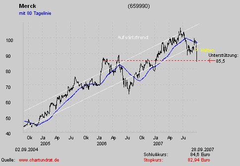 Die Merck Aktie bewegte sich in einem langfristigen Aufwärtstrendkanal. Aus diesem ist sie am 27.09.2007 erneut signifikant d.h. mehr als 3% nach unten ausgebrochen. Dadurch hat sich das Chartbild eindeutig verschlechtert, denn die Gefahr eines Trendwechsels erscheint möglich. Sollte es der Merck Aktie kurzfristig jedoch wieder gelingen in den Aufwärtstrend zu gelangen, so hat dieser weiterhin bestand. Aus diesem Grunde bleibt die Aktie daher unter Beachtung des nächsten Stop-Kurses (siehe Unterstützung) weiterhin nur noch eine Halteposition.