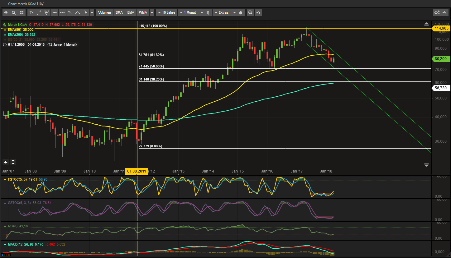 Zudem ist Charttechnik nicht alles. Wenn ein defensiver Qualitätswert wie Merck vom ATH derart stark fällt, dann leitet sich ein gutes CRV auch vom bisherigen Fall eines Werts ab. Die Wahrscheinlichkeit dass Merck wesentlich tiefer als 75€ fäält, ist gering. Ergo, eine überdurchschnittliche Renditechance vertan.