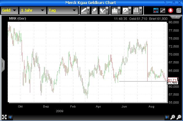 Bei Merck sitzt die Erbitux-Enttäuschung noch tief, was nach Ansicht der Experten des Frankfurter Börsenbrief aber wenig Sinn hat. Die Aktie war unter Druck geraten, nachdem sich ein wissenschaftlicher Ausschuss der europäischen Arzneimittelbehörde EMEA gegen den Einsatz des Mittels bei Lungenkrebs im fortgeschrittenen Stadium ausgesprochen hatte. Die Schwierigkeiten bei der Erweiterung der Zulassung auf diese Indikation sind im Kurs eingepreist. Allerdings ist die konjunkturelle Erholung noch nicht ausreichend berücksichtigt. Merck steht nicht nur für Pharma, sondern auch für Chemie mit Spezialprodukten für verschiedene Industriezweige wie Biotech, Pharma, aber auch Kosmetik, Farben und Elektronik. Im Jahr 2008 steuerte das Chemiegeschäft zwar nur etwa 28 Prozent zum Konzernumsatz bei, aber 46 Prozent zum operativen Ergebnis. Bei einer sich stabilisierenden oder auch erholenden Konjunktur könnte Merck positive Überraschungen bieten. Während viele andere Aktien bereits den Höhenflug absolvierten, ist Merck noch in der Nähe der Tiefstände, was Nachholpotenzial eröffne. Bei Notierungen von mehr als 66,35 Euro sollte die Aktie deshalb mit einem Kursziel von zunächst 75 Euro gekauft werden. Ein Engagement ist bei 62,70 Euro abzusichern. Das Merck allerdings unter 62€ liegt, ist aus Chartsicht äußerst bedenklich. Sollten die Amis den wert nicht wieder über 62€ heben, geht es weiter runter, allerdings gemessen an den Stückzahlen ist das nicht so dramatisch. Ist nur meine Meinung