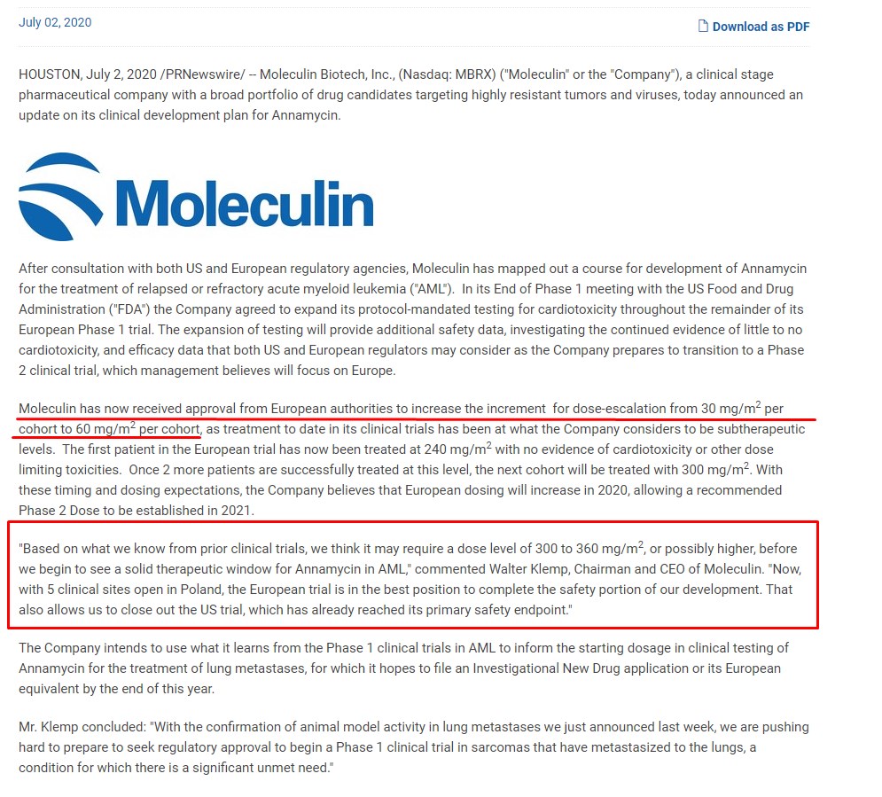 "... Moleculin hat nun von den europäischen Behörden die Genehmigung erhalten, die Erhöhung der Dosis-Eskalation von 30 mg/m2 pro Kohorte auf 60 mg/m2 pro Kohorte zu erhöhen, da die Behandlung in den bisherigen klinischen Studien auf einem nach Ansicht des Unternehmens subtherapeutischen Niveau lag. Der erste Patient in der europäischen Studie wurde nun mit 240 mg/m2 behandelt, ohne dass Hinweise auf Kardiotoxizität oder andere dosisbegrenzende Toxizitäten vorlagen. Sobald zwei weitere Patienten erfolgreich auf diesem Niveau behandelt wurden, wird die nächste Kohorte mit 300 mg/m2 behandelt. Angesichts dieser Zeit- und Dosierungserwartungen geht das Unternehmen davon aus, dass die Dosierung in Europa im Jahr 2020 ansteigen wird, so dass im Jahr 2021 eine empfohlene Phase-2-Dosis festgelegt werden kann.