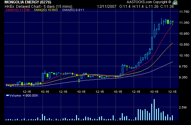 Shares of Mongolia Energy Corp Ltd rose 4.06