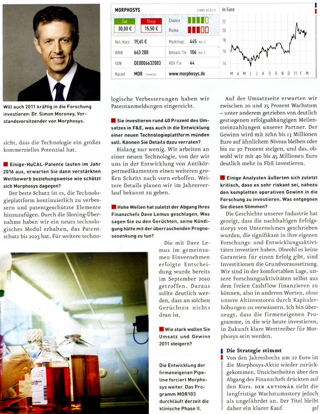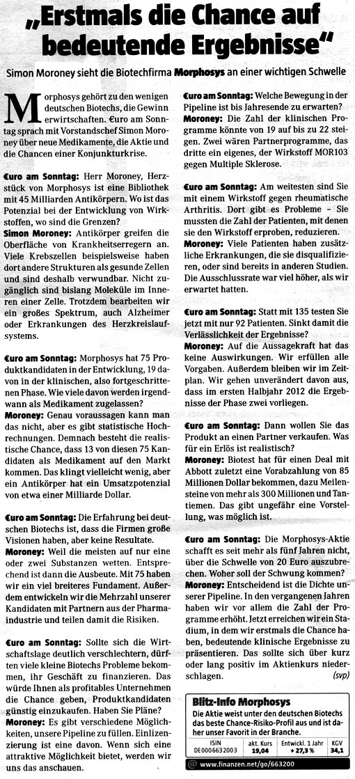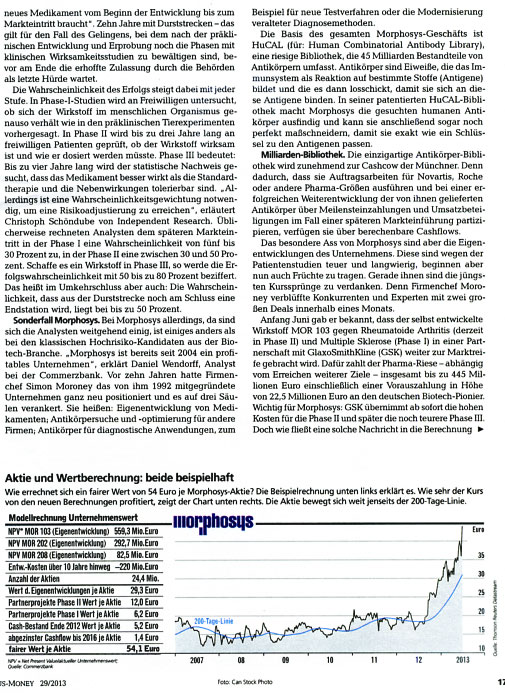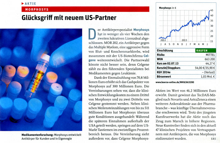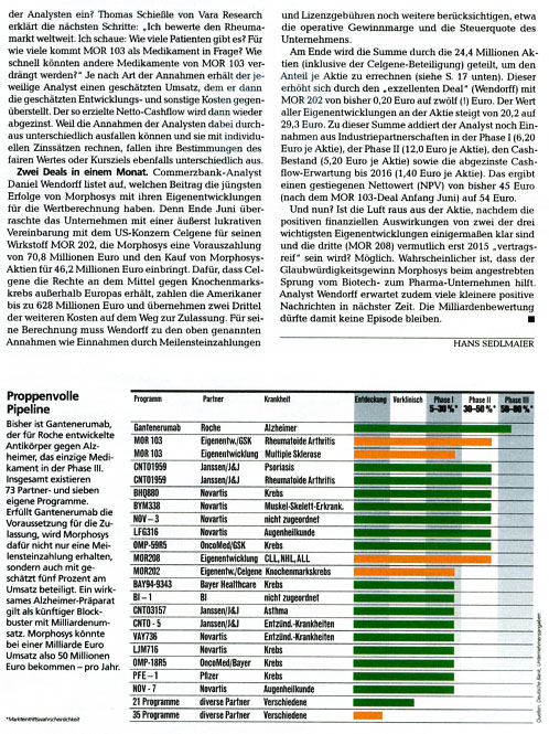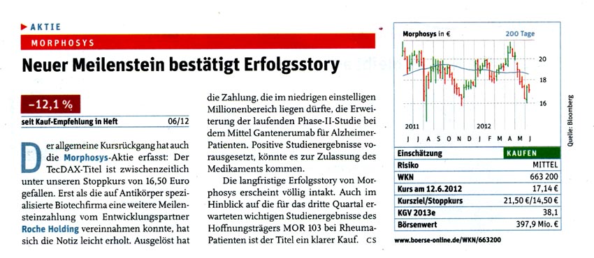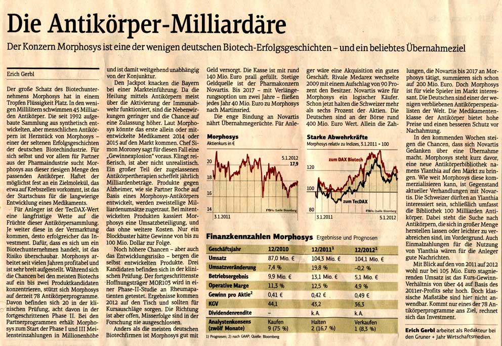 Da ich kostenlosen Zugang zu Zeitschriften wie Focus Money, Wirtschaftswoche, €uro am Sonntag, €uro, Capital, Börse Online u.a. hab, stelle ich hier Berichte für Morphosys-Interessierte zur Verfügung. Kein Anspruch auf Vollständigkeit.