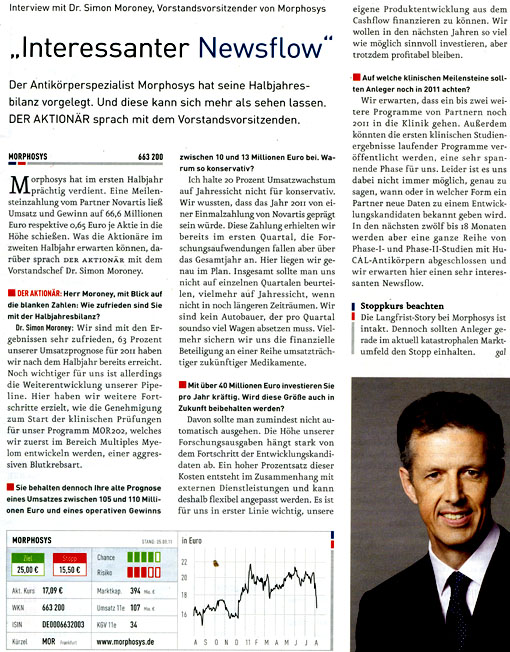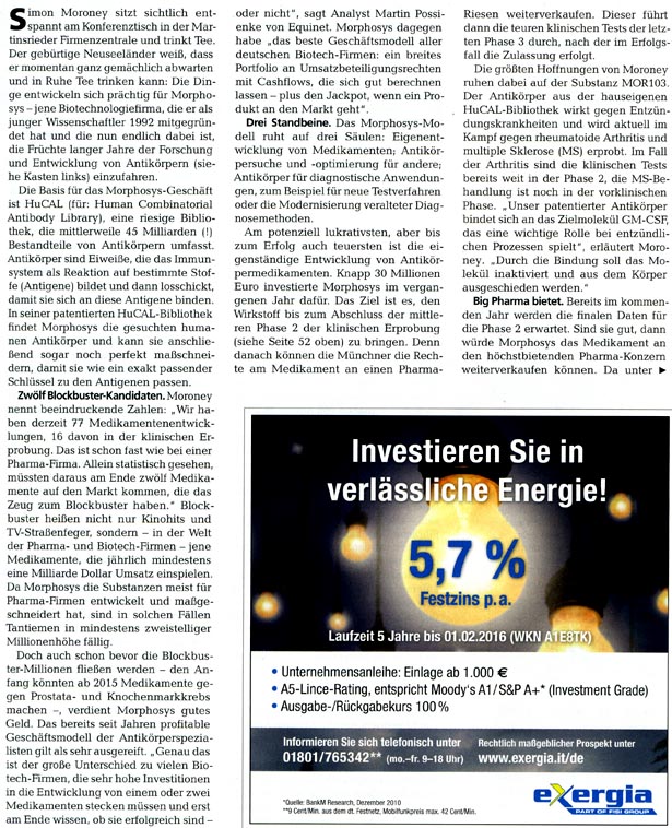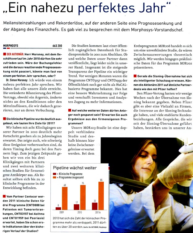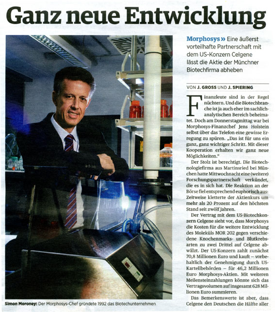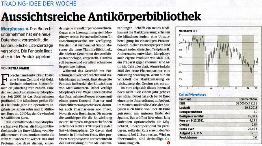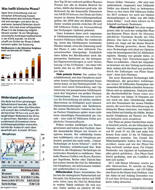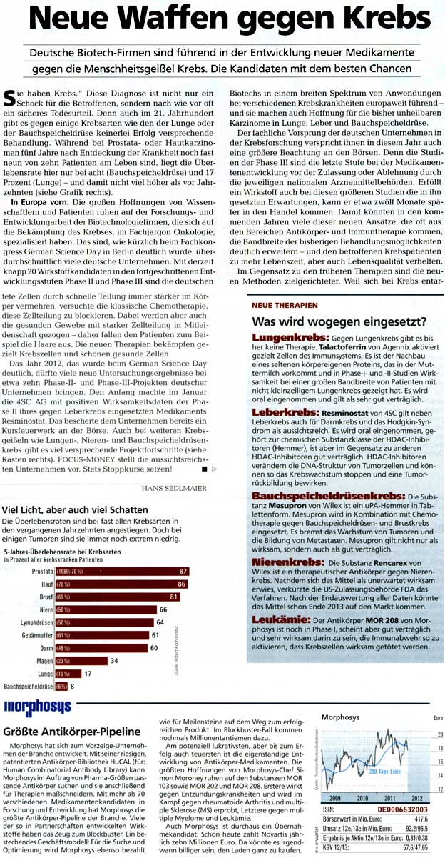 Da ich kostenlosen Zugang zu Zeitschriften wie Focus Money, Wirtschaftswoche, €uro am Sonntag, €uro, Capital, Börse Online u.a. hab, stelle ich hier Berichte für Morphosys-Interessierte zur Verfügung. Kein Anspruch auf Vollständigkeit.