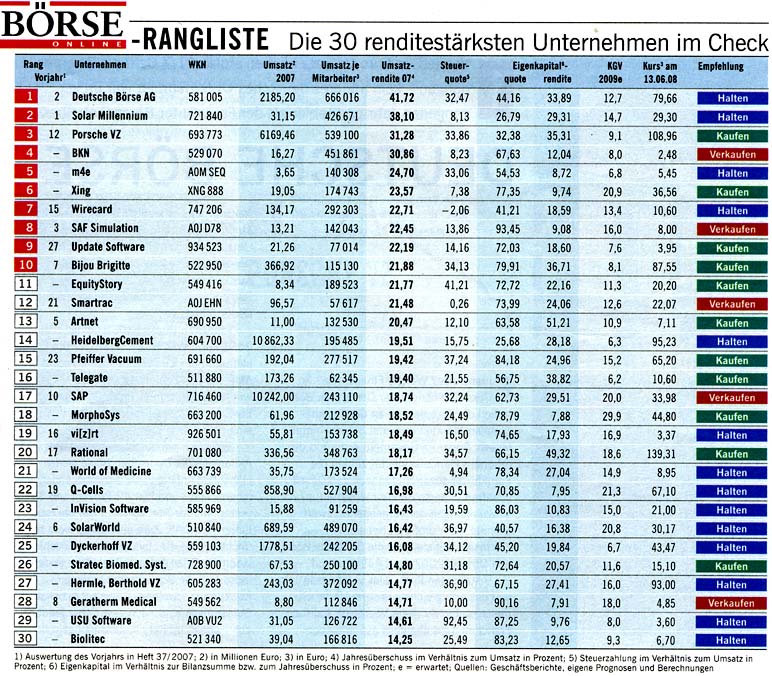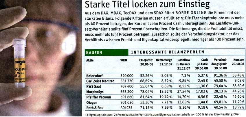 ... Besonders Lukrativ sind Tech-Werte. Zu Zeiten des Nemax 50 galten sie als interessante Hoffnungswerte. Mittlerweile glänzen manche als wahre Ertrags- und Cash-Perlen, die dabei nichts von ihrem Wachstumspotenzial verloren haben. Beispiel MorphoSys: Das Biotech-Unternehmen aus Martinsried hat derzeit einen Börsenwert von rund 330 Millionen Euro und einen Cash-Bestand - inklusive Wertpapiere - von 126 Millionen Euro. Jeder Euro Börsenwert ist also mit 0,38 Euro Barem unterlegt. In den nächsten Jahren bekommt die TecDAX-Firma durch einen Deal mit dem Schweizer Pharmariesen Novartis weitere 600 Millionen Dollar überwiesen. 400 Millionen Dollar könnten an Meilensteinzahlungen hinzukommen - das erhöht den Forschungsspielraum und sorgt auch künftig für volle Kassen. Selbst die Schulden sind im Vergleich maßvoll: Bei MorphoSys beträgt der Verschuldungsgrad lediglich 28 Prozent. Von einem angemessenen Verhältnis sprechen Experten, solange das Fremdkapital nicht mehr als das Dreifache des Eigenkapitals beträgt, also 300 Prozent oder weniger. (hier gekürzt)
