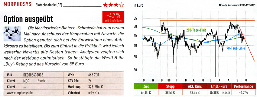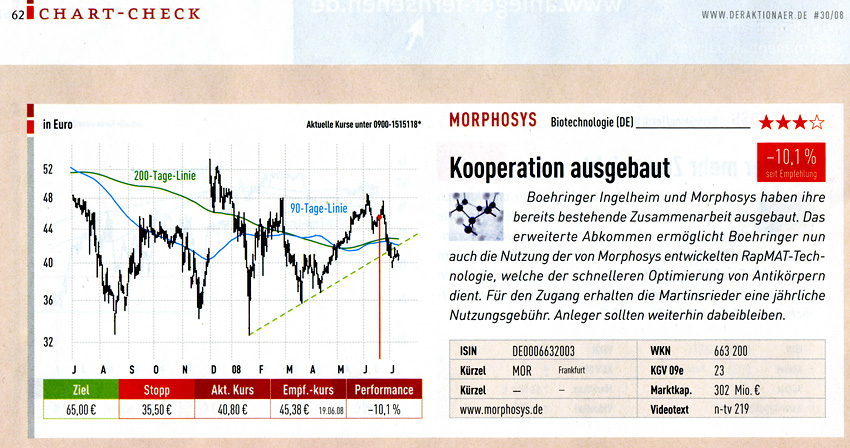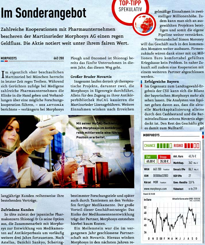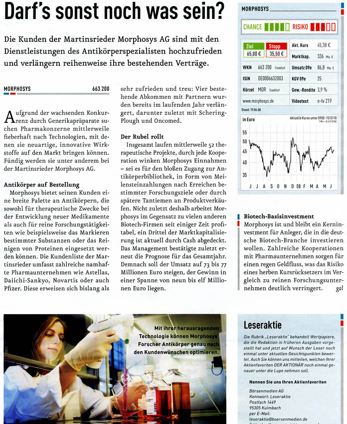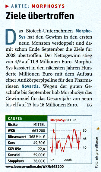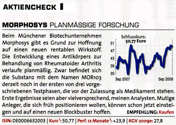 Morphosys hat gerade die Gewinnprognose für 2008 erhöht und kann in schöner Regelmäßigkeit Fortschritte mit eigenen Projekten und Kooperationen präsentieren. "Antikörper sind zwar keine aufregende neue Technologie mehr, aber nachdem Erfolg zahlreicher auf Antikörpern basierender Medikamente wie Avastin oder Herceptin rollt eine zweite Welle mit Neuentwicklungen auf uns zu", kommentiert der Fondsmanager Markus Manns von Union Investment.