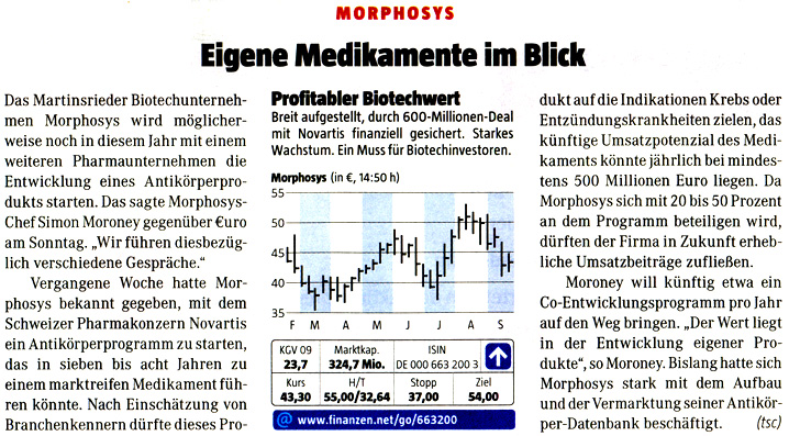Überhaupt sind deutsche Biotechunternehmen wieder in den Blickpunkt von Investoren gerückt. Weil sie international noch nicht so große Aufmerksamkeit erregen, hoffen mittlerweile einige deutsche institutionelle Investoren, sich hier frühzeitig eine gute Investmentstory zu sichern. Immer wieder genannt werden Medigene aufgrund des neuen Krebsmedikament-Kandidaten mit überzeugenden Phase-2-Daten - und Morphosys als profitables, ganz offenbar umsichtig wirtschaftendes Technologie- und Wirkstoffunternehmen.