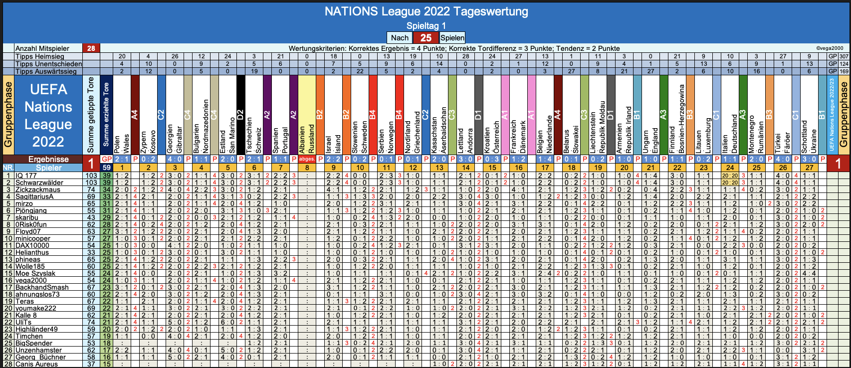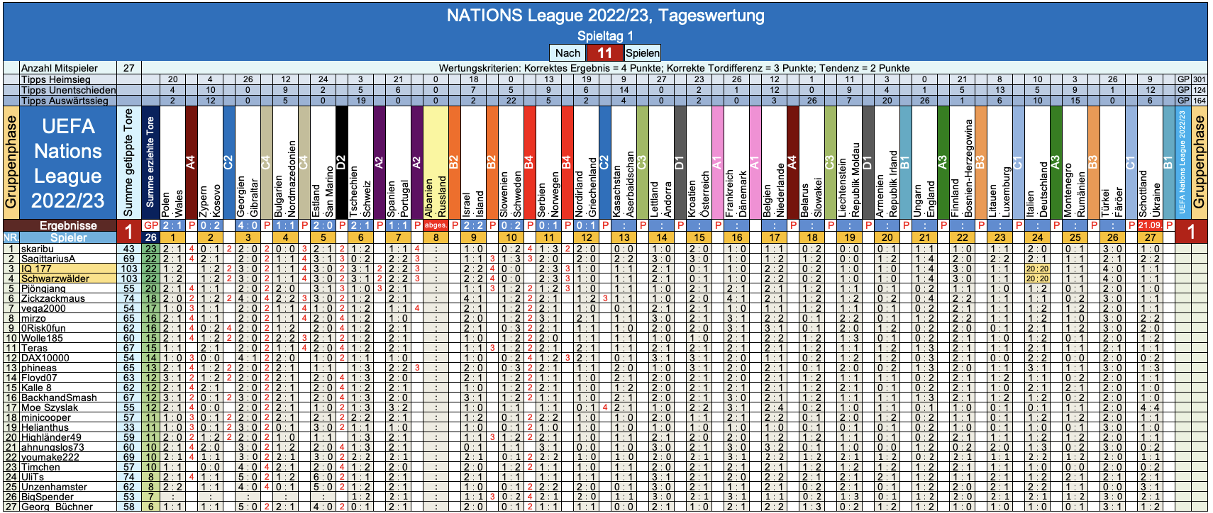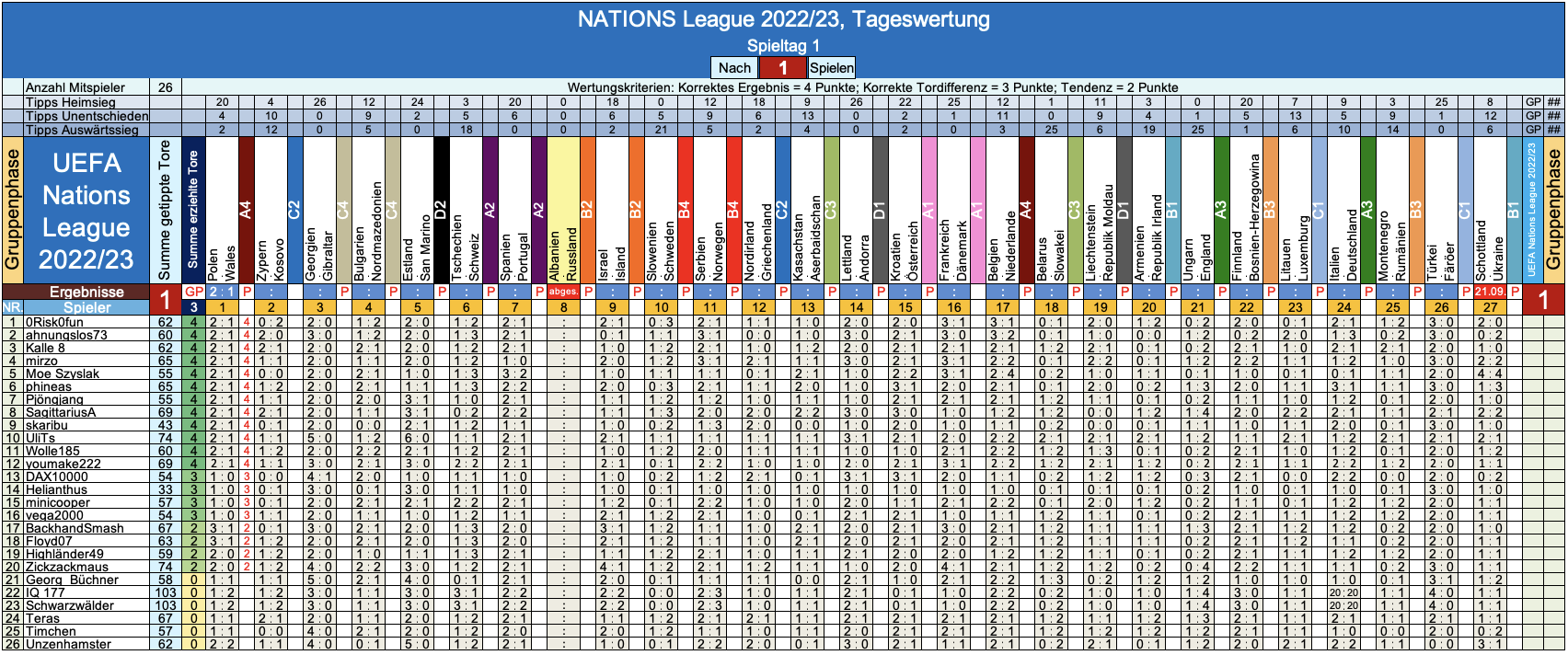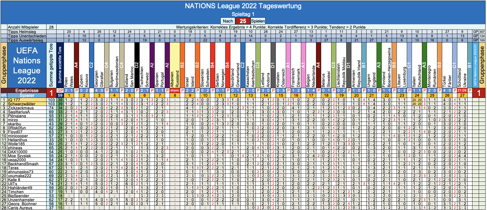 So macht das Tippen auf die NATIONS League ja doch gleich noch viel mehr Spaß ! - Wer wird unser glücklicher Gewinner der aktuellen Saison 2022/23 ? - Das wissma ja noch laaaaange nicht, aber mit dem fröhlichern Tippen geht's jetzt flott weiter dort: