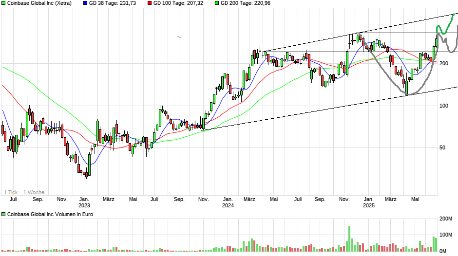 Bereits am gestrigen Donnerstag kletterte die Coinbase-Aktie auf ein neues Allzeithoch. Am Freitagvormittag legt die Kryptoplattform mit einem Kursplus von über +2% im europäischen Handel noch eine Schippe drauf. Gibt es denn schon wieder gute Nachrichten von Coinbase und sollten Anleger jetzt noch in den Kryptowert einsteigen?