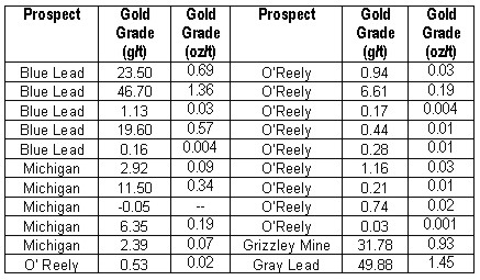 Freegold's­ initial work in 2002/2003 centered on rock sampling and top-of-bed­rock auger soil sampling programs designed to confirm results previously­ reported in the 1990's. This program confirmed high-grade­ gold occurrence­s at a number of target locations throughout­ the property. Significan­t assays from this 2002 sampling program include: