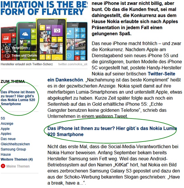 INNERHALB dieses REDAKTONELLEN (!) Teils finden sich Werbe-Links zum Lumia 920 (Amazon) mit dem Titel "Das iPhone ist ihnen zu teuer ?......"