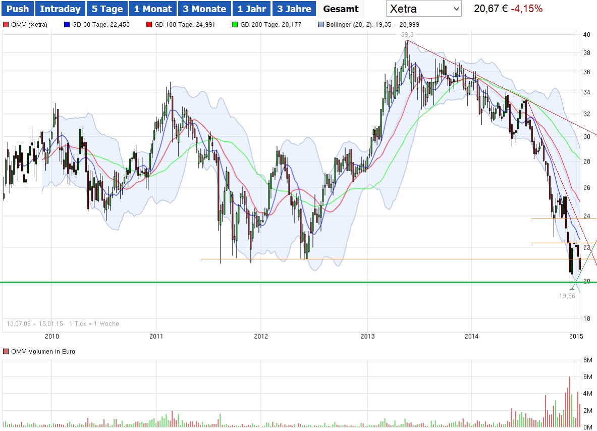 Dann würde ich schauen, ob er Kurs nochmals gen 20,- rauscht und dort nach legen, ansonsten eher warten bis OMV die 23,60 dauerhaft überschreitet. Dies würde bedeuten, dass der steile Abwärtstrend seit 07.2014 gebrochen wäre. Bei 23,60 wäre auch der übergeordnete flacher verlaufende Abwärtstrend seit 09.2013 gebrochen und die Aktie könnte tatsächlich zu einer Erholung in Richtung Buchwert ansetzen.