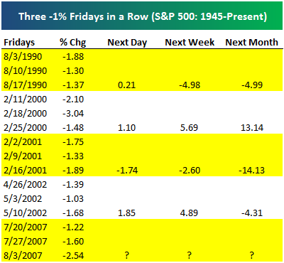 Below we highlight the prior 4 times it occurred. As shown, the first didn't happen until August 1990, and the market was down significan­tly the following week. It happened again in February 2000, and while the market bounced in the short term, we all know where it went from there. In February 2001 and May 2002, the S&P 500 again saw 3 straight Fridays of -1% or more, and while results were mixed over the following week, the following month was down quite a bit.