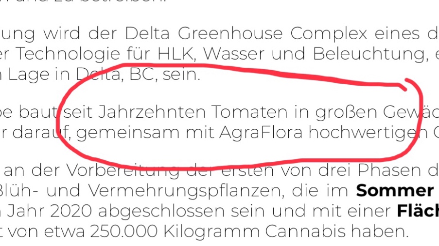 In Delta (British Columbia) arbeitet AgraFlora weiterhin mit seinen Joint-Venture-Partnern zusammen, um einen bestehenden 2.200.000 Quadratfuß großen Tomatengewächshauskomplex zu einer Cannabisproduktionsstätte umzuwandeln. Die erste Phase der Umrüstung liegt im Zeitplan, um bis zum Sommer 2019 einen Blütebereich mit einer Größe von 250.000 Quadratfuß fertigzustellen. AgraFlora beabsichtigt, den insgesamt 1.700.000 Quadratfuß großen Blütebereich bis Ende 2019 fertigzustellen, und die letzte Phase der Gewächshausumrüstung soll einen weiteren 450.000 Quadratfuß großen Blütebereich beinhalten, der im Sommer 2020 fertiggestellt werden soll.