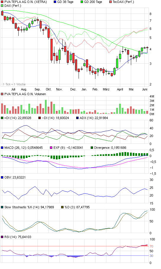 Die Pva TePla ist somit signifikant unterbewertet. Die Kurseinbrüche resultieren zum wesentlichen aus Not- und Panikverkäufen. Das Handelsvolumen hat in den vergangenen Tagen signifikant abgenommen. Dies deutet darauf hin, dass die Abverkäufe langsam auslaufen und somit der Kurs kurs vor dem Ausbruch steht, da die derzeitigen Aktionären zum größten Teil nicht mehr bereit sind die Aktie unter ihrem tatsächlichen Wert zu verkaufen.