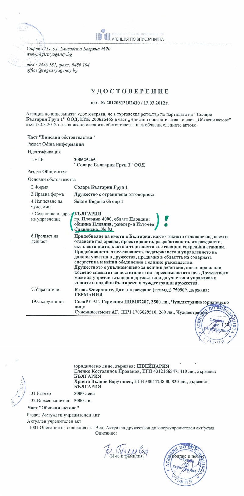 Übrigens sind neben der Adresse auch die Telefonnummern der Solare Bulgaria Group 1 OOD und der BIO GARD OOD identisch (00359 032 625391), und wenn man dort anruft, landet man bei einer bulgarischen Anwaltskanzlei, scheint beliebt zu sein...