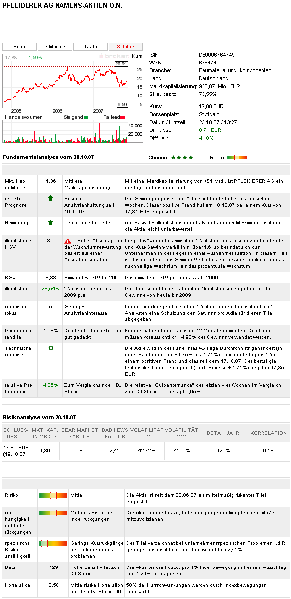 Die Experten vom "Wertpapier" halten den Titel mit einem KGV 2008e von 11,2 für äußerst günstig bewertet und empfehlen, die Pfleiderer-Aktie zu kaufen. (Ausgabe 23) (15.11.2007/ac/a/d)