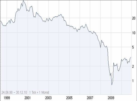 Schaut man sich den Langzeit-Chart an, sieht man nach dem typischen "Krisenknick" in 2008, wie der Wert 2009 lange um die 2€ pendelte und 2010 deutlicher zulegen konnte.