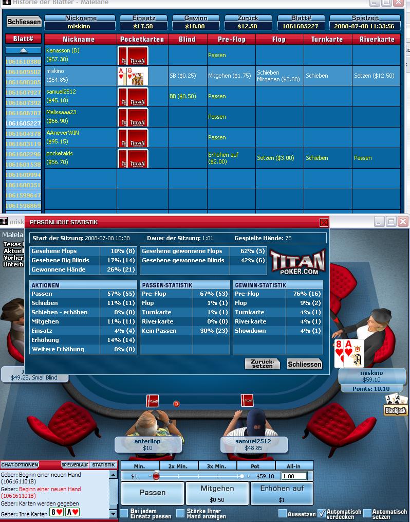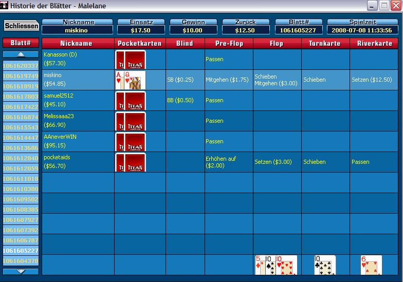 Bekomme auf dem SB sitzend den 4xBB raise und calle nur mit AQ. Normalerweise entweder fold oder reraise...aber ich hatte Position. AUf den Flop gecheckt, dann die Erhöhung auf 3$ gecallt...usw..sieht man ja unten...nachdem er auf den Turn keine pockets signalisiert hat, habe ich sie auf den River gespielt!