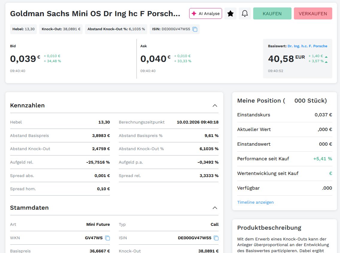 Dieser (recht neue Long-Hebel) steht jetzt auch schon wieder bei 84% meiner Verluste mit der Aktie. Und das, obwohl er mein am wenigsten erfolgreicher Longhebel für Porsche ist.