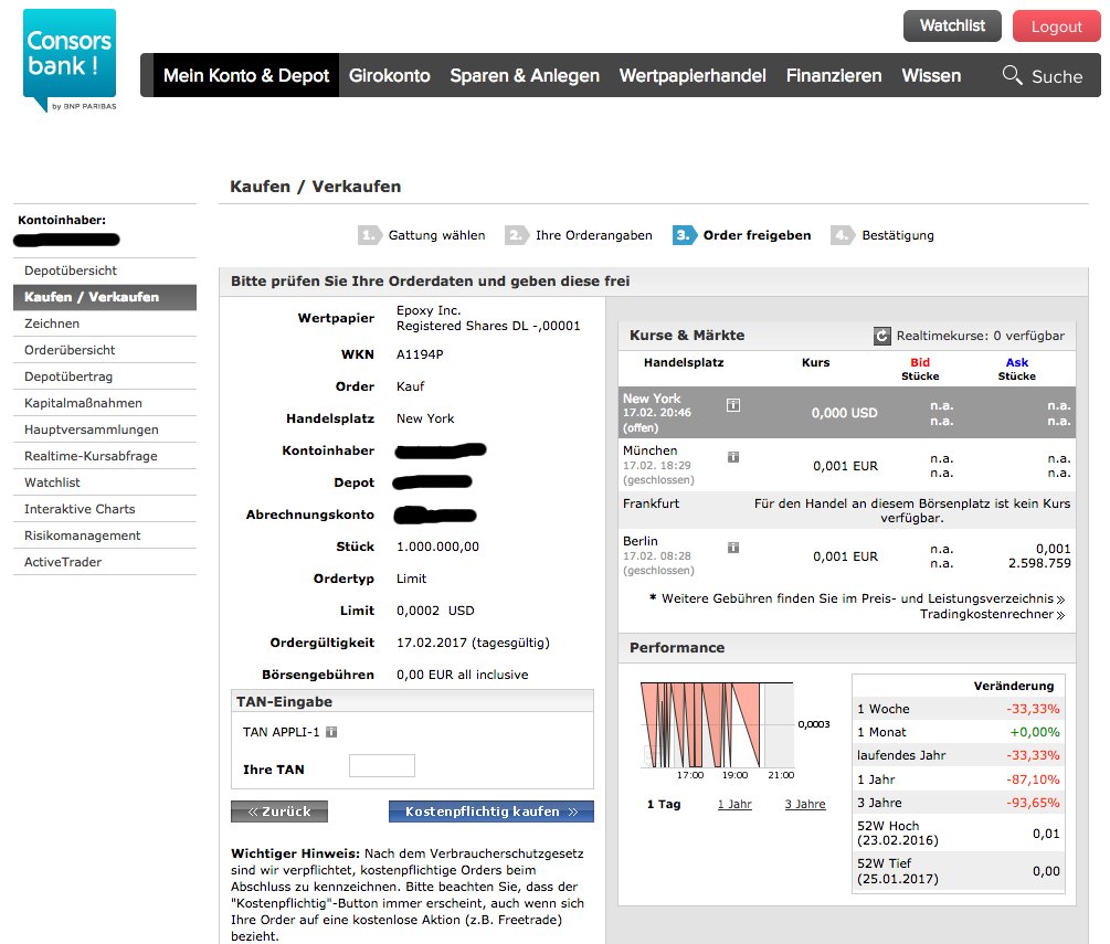 Deutschland derzeit aufgrund der CoBa compliance Regularien nicht in den USA gehandelt werden. Auf Rückfrage sagte man mir das bei dem letzten Sprung von 0.0002 auf 0.001 Manipulationsverdacht besteht. Ich hatte so etwas vor einem halben Jahr bei Epoxy schon mal. Ein paar Tage später konnte man dann wieder ganz normal handeln. Wie man mir bei der Comdirekt sagte kann sich das täglich ändern da die Papiere täglich neu überprüft werden. Besteht weiterhin der Manipulationsverdacht bleiben die Papiere weiterhin gesperrt. Die letzte deutliche Verwässerung mit dem äußerst unverständlichen Hype um die Milliardenfach auf dem Markt gebrachten Papiere lassen ja durchaus die Vermutung von Manipulation zu.