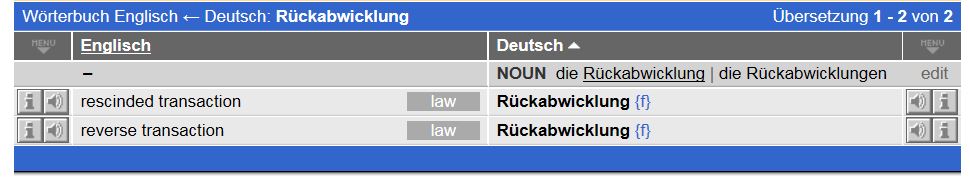 Die Frage, wie denn Rückabwicklung übersetzt wird, haben mir beide beantwortet mit "rescinded bzw. reverse transaction", also genau wie diverse Internet-Wörterbücher es übersetzen.