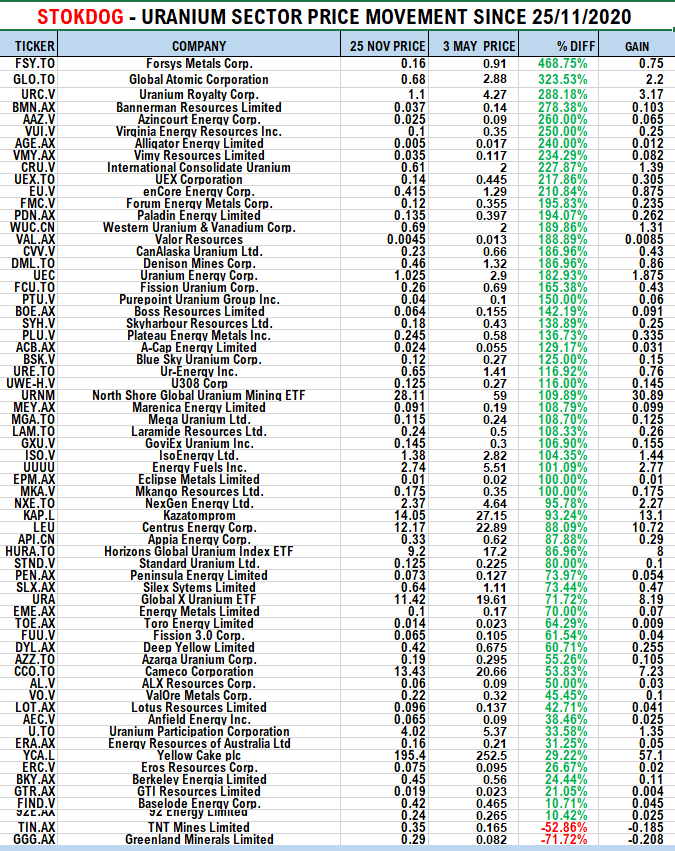 Jetzt steigen die wo ich mit Minigewinn raus bin. Ist aber o. K im Vergleich zu anderen Uran Aktien langweilig. Wobei deine Liste zeigt, dass man auch richtig auf die Nase fallen kann. Ist immer drin deshalb kleines Plus mitnehmen und zufrieden sein.