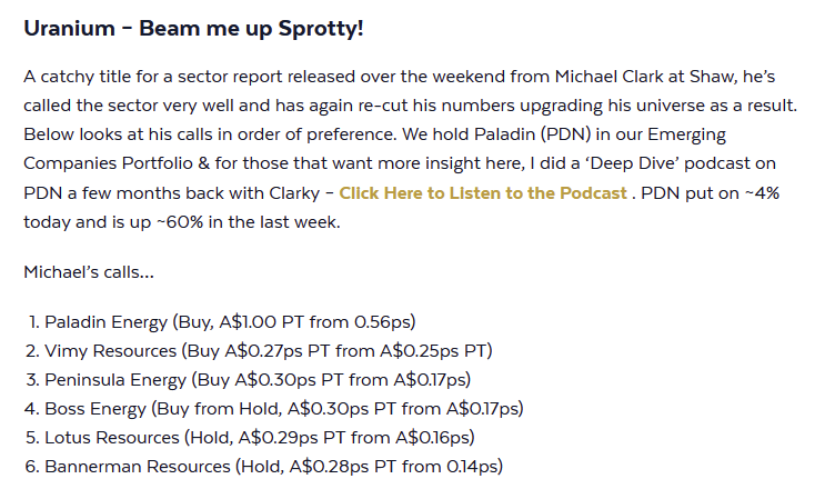 Der SPUT war voll mit 300 M. Einheiten , sodass er sein Prospekt verändert hat um 1,3 B Einheiten ausgeben zu können.Das musste aber erst mit den Brokern geklärt werden, das ist heute geschehen. Der Uran spot Preis ist trotzdem die letzten Tage (Sprott kauft seit Donnerstag nicht) weiter gestiegen und es hat sich ein Premium auf den SPUT ausgeweitet, ab heute wird er wieder aktiv , egal wer in den letzten Tagen (wahrscheinlich Uran Förderer um Abnahmeverpflichtung erfüllen zu können) den Spot-Preis getrieben hat , Sprott tut es ab heute auch wieder.