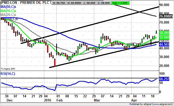 It seems difficult to believe that there could be further upside after shares of Premier Oil have tripled since the lows of the year. However, it would appear the stock is in a rising trend channel in place since December. The floor of the channel currently runs at 47p / 20 day moving average. This should mean that at least while we remain above this combinatio­n of support the top of the late 2015 price channel at 90p could be on its way over the next 1-2 months.