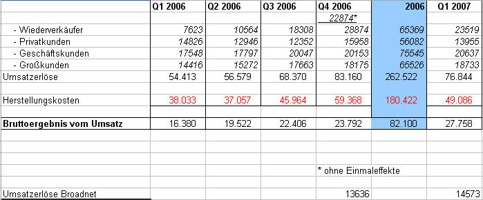 ist man ohne Broadnet seit dem 2.Quartal 2006 kaum gewachsen. Genau deswegen dürften die Anleger auch immer skeptischer werden, ob KGVs von über 30 für QSC angebracht sind. Ich persönlich halte ein KGV08 von 25 für fair, und wenn QSC seine Prognosen einhält, würde das einem Kursziel auf Sicht von 12 Monaten von 7 € entsprechen. Nur sehe ich es nicht so wie Ananas. QSC hat durchaus schon öfter enttäuscht, aber es immer gut dargestellt. Das kann der Vorstand besonders gut.