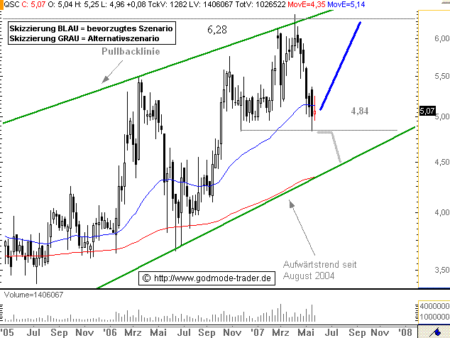 Rückblick: Die QSC Aktie markierte im Dezember 2002 ihr Allzeittief bei 0,32 Euro. Danach kam es zu einer steilen Rallye auf 6,28 Euro. Dieses Hoch erreichte die Aktie im Februar 2004. Nach einer schnellen Abwärtsbewegung auf 2,66 Euro im August 2004, zog die Aktie wieder an. Dieses Mal ging die Aufwärtsbewegung deutlich langsamer vonstatten. Erst in der 1. Aprilwoche 2007 erreichte die Aktie das Hoch aus 2004 wieder. Dort prallt die Aktie zunächst ab und fiel bis letzte Woche auf die Unterstützung bei 4,84 Euro zurück.