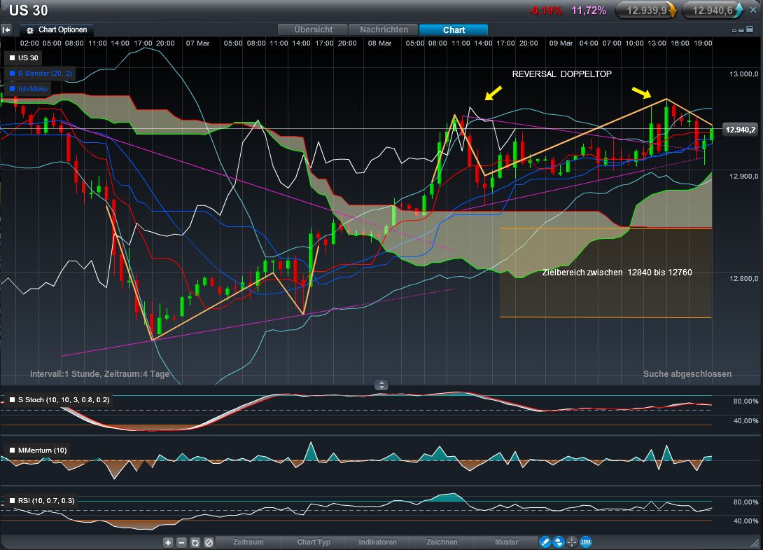 Hat ein Reversal Doppeltop (höchste Signal Qualität 5 Sterne von 5 !) gebildet mit Zielbereich zwischen 12760 bis 12840 !