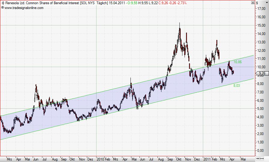Jedoch scheint mir die Renesola-Aktie mittlerweile fundamental richtig ausgebombt zu sein mit einem 2011er KGV von 4,3 und einem 2011er Mutiple EV/EBIT von 3,7. Ist dann schon sau billig. Das 2011er KUV liegt bei 0,5 und das 2011er KBV bei 1,1.