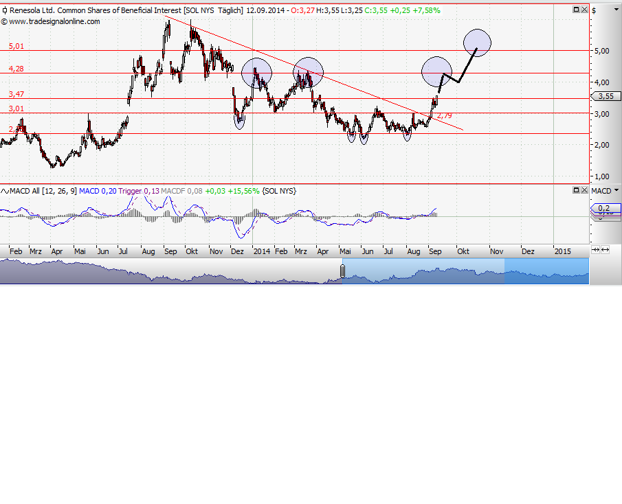 Naja, bin froh gestern nochmal Nordex verkauft und Renesola eingekauft zu haben. Einstieg war zwar "schlecht" (bei 2,66 €), aber ich dachte die India News (10 MW) haut mehr rein. Naja, manchmal wirken die News auch erst einen Tag später. Und mittlerweile ist diese Posi auch im Plus. Ich denke jetzt zu verkaufen war ein Fehler, da Renesola locker noch bis 4,30$ Platz hat, sind immerhin nochmal 20%, vor allem jetzt da die 3,50 genommen wurde und auf Tageshoch geschlossen wurde. Gestern standen wir kurzzeitig bei 3,18! aber ich denke das geht als Testen der GD200 durch, was ja als bullisch zu bewerten ist. Naja, bin froh seit kurzenm wieder an Bord zu sein :-) (Trick war übrigens dass ich meine Nordex Aktien gegen einen KO-Schein getauscht habe und somit viel Nordex-Kapital frei geworden ist. Dafür sitz ich jetzt aufm Pulverfass falls Nordex nochmal abschmiert)