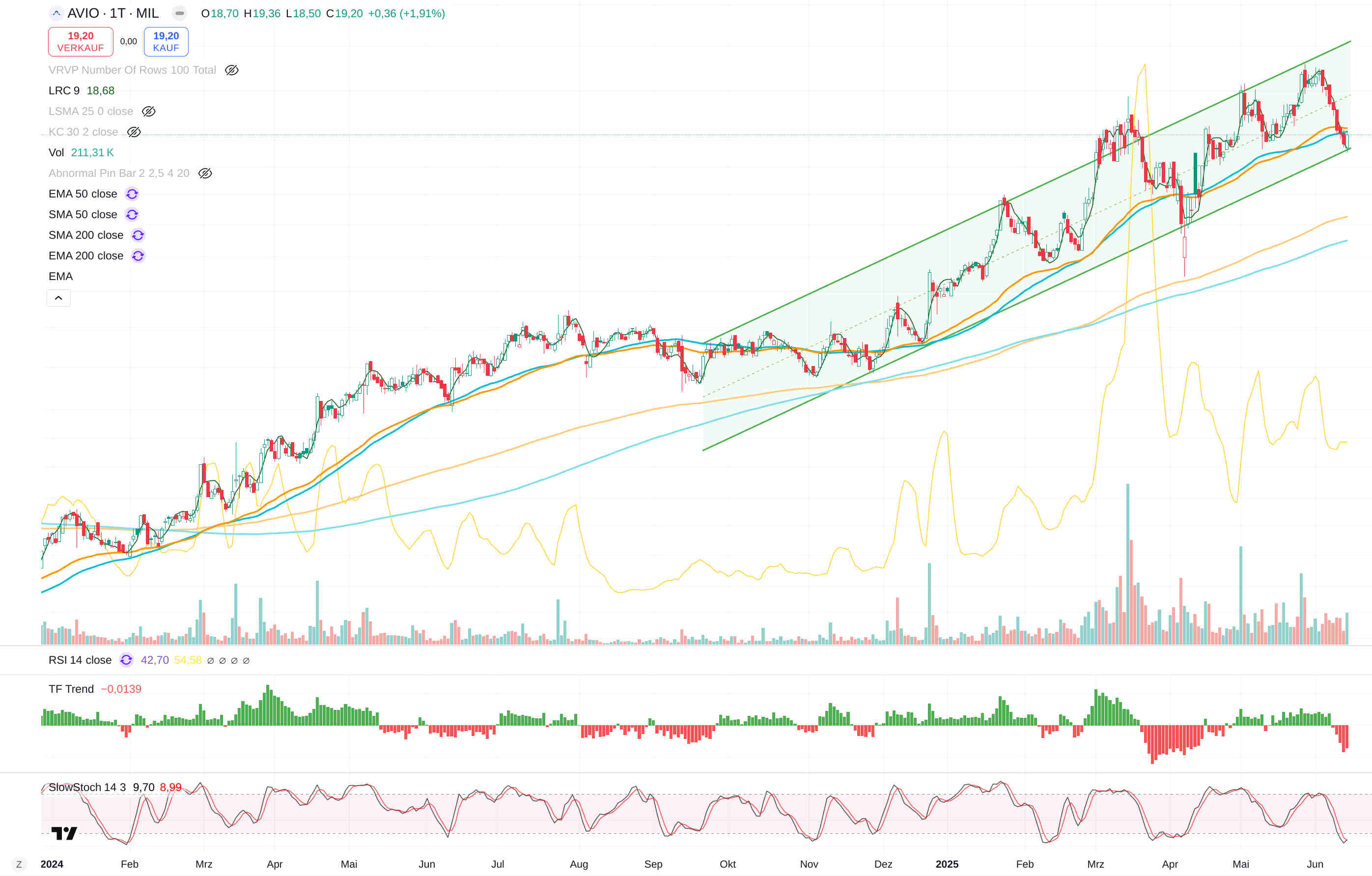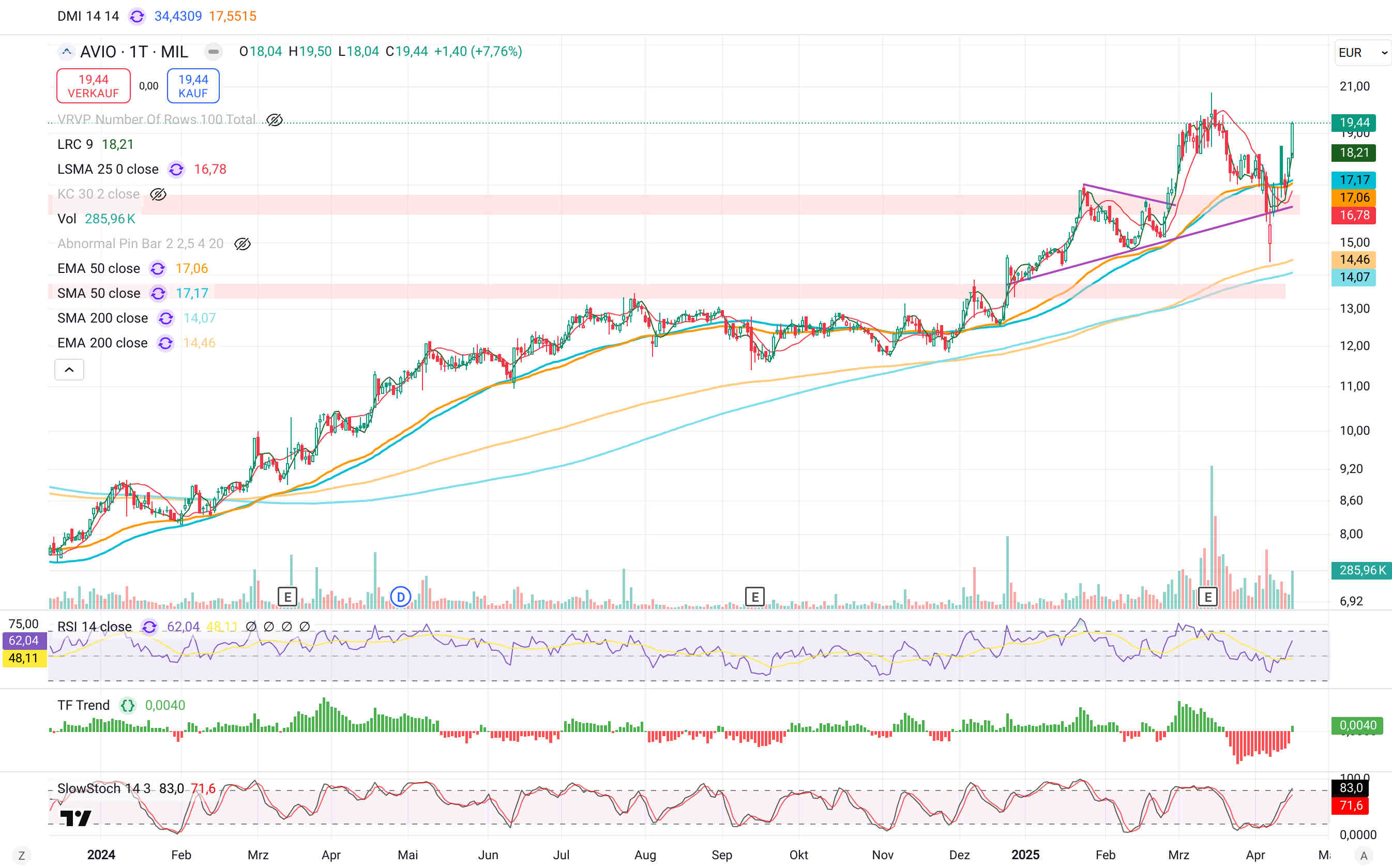 Avio ist an einer unteren Trendbegrenzung eines Aufwärtstrends + 50er Linien angelangt + Slow Stochastik im stark überverkauften Bereich positiv gekreuzt.