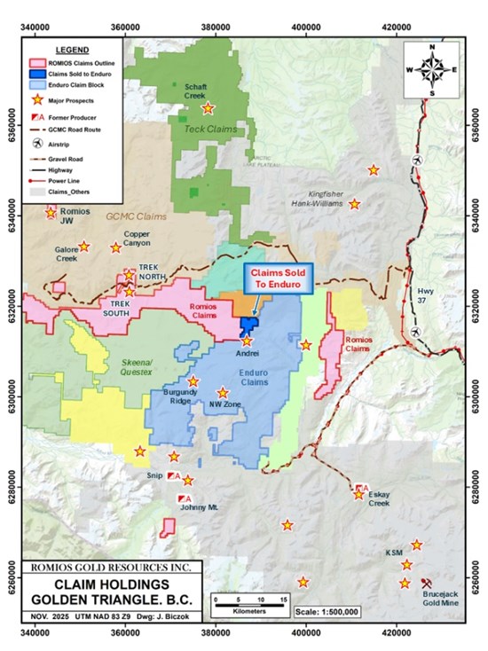 Toronto, Ontario--(Newsfile Corp. - November 10, 2025) - Romios Gold Resources Inc. (TSXV: RG) (OTCID: RMIOF) (FSE: D4R) ("Romios Gold" or the "Company") is pleased to announce that is has sold a 100% interest in a 1,200 hectare claim package to Enduro Metals Corp. ("Enduro") for $300,000 cash. Romios Gold retains a 2% net smelter returns royalty in the claims (the "2% NSR"). The three (3) claims (the "Royalty Property") are located adjacent to Enduro's 'Andrei' target on its Newmont Lake project (see Figure 1) and encompass a large magnetic high, part of a newly recognized trend of both magnetic and geochemical anomalies suggestive of porphyry copper-gold potential.