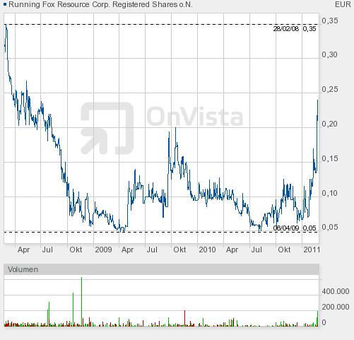 Running Fox Resource Corp. (WKN A0F41Q ) Expansion durch eigenen Cash Flow, das ist das Geschäftsmodell der Running Fox, durch dessen Strukturierung das Unternehmen einen signifikanten Hebel zu Erdgas, Uran und Gold besitzt. Der durch die Geschäftsbereiche Gas und Öl sowie Öl- und Gasfeld-Service & Technologie für Energieprojekte generierte Cash Flow wird es dem Unternehmen erlauben, ohne weitere größere Finanzierungen zusätzliche Gasquellen zu erschließen und seine Gold- und Uranprojekte zu explorieren. Die Kanadier haben in den ersten neun Monaten 2007 einen Umsatz von 4,5 Millionen CAD erzielt. Bei unserer Empfehlung stand die Aktie bei 0,41 EUR, heute bei 0,29 EUR. Wir sehen das Potenzial auf 0,60 EUR. (Ursprüngliche Empfehlung 1,00 EUR)