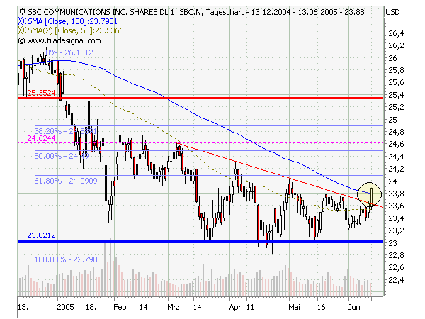 SBC - chartteschnisches Kaufsignal !! SBC konnte den Abwärtstre­ndkanal der seit Februar diese Jahres besteht mit einer langen weißen Kerze nach oben durchbrech­en. Gerstern wurde bereits die 50er SMA genommen, heute war die 100er SMA an der Reihe. Wichtig wäre ein Schlusskur­s über 23,80. Morgen sollte der Ausruch mit einer erneuten Kurssteige­rung bestätigt werden.