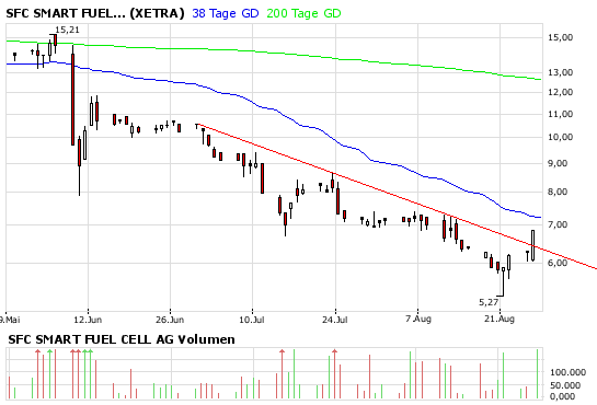 gestiegen war, kann ich mir nicht erklären, außer vielleicht das man die Aktie mit der Branche verglichen hat und andere Brennstoffzellen-Aktien, vor allem aus Nordamerika, sind um ein vielfaches höher bewertet als SFC, obwohl SFC bereits mit den Produkten am Markt ist und viele Auszeichnungen bekommt.
